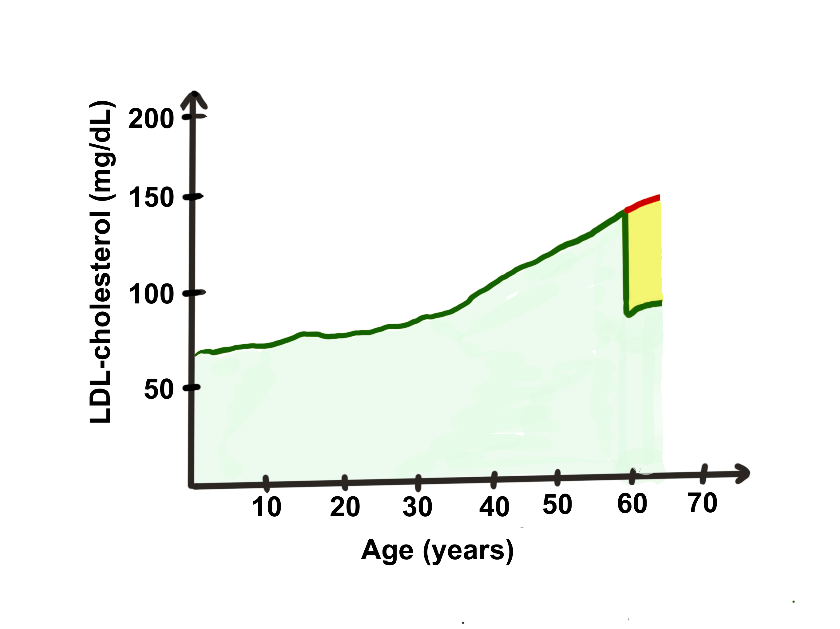 对于包括 LDL 胆固醇在内的每种风险因素,最重要的暴露量是累积终生暴露量,可通过曲线下面积(此处浅绿色阴影)来衡量。重要的是要考虑到任何降脂疗法对累积暴露量的影响在短期内都很小。绿色:60 岁时开始接受降脂疗法的人。红色:未开始接受降脂疗法的人。
