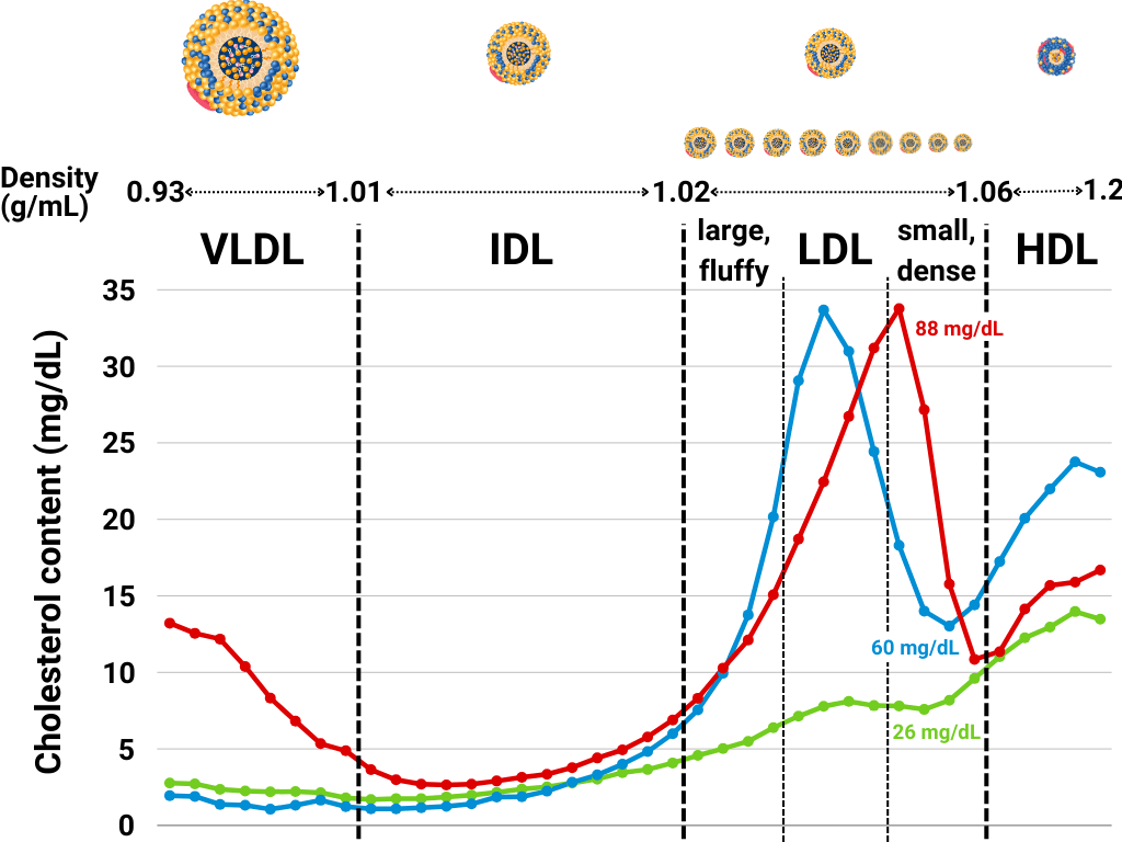 图中显示了整个密度范围内 VLDL、IDL、LDL 和 HDL 颗粒中的胆固醇含量,这使我们能够识别出 LDL 胆固醇主要存在于小而致密的 LDL 颗粒中的个体,如红线所示。然而,蓝线所代表的人在其小而致密的 LDL 颗粒中携带的胆固醇很少。