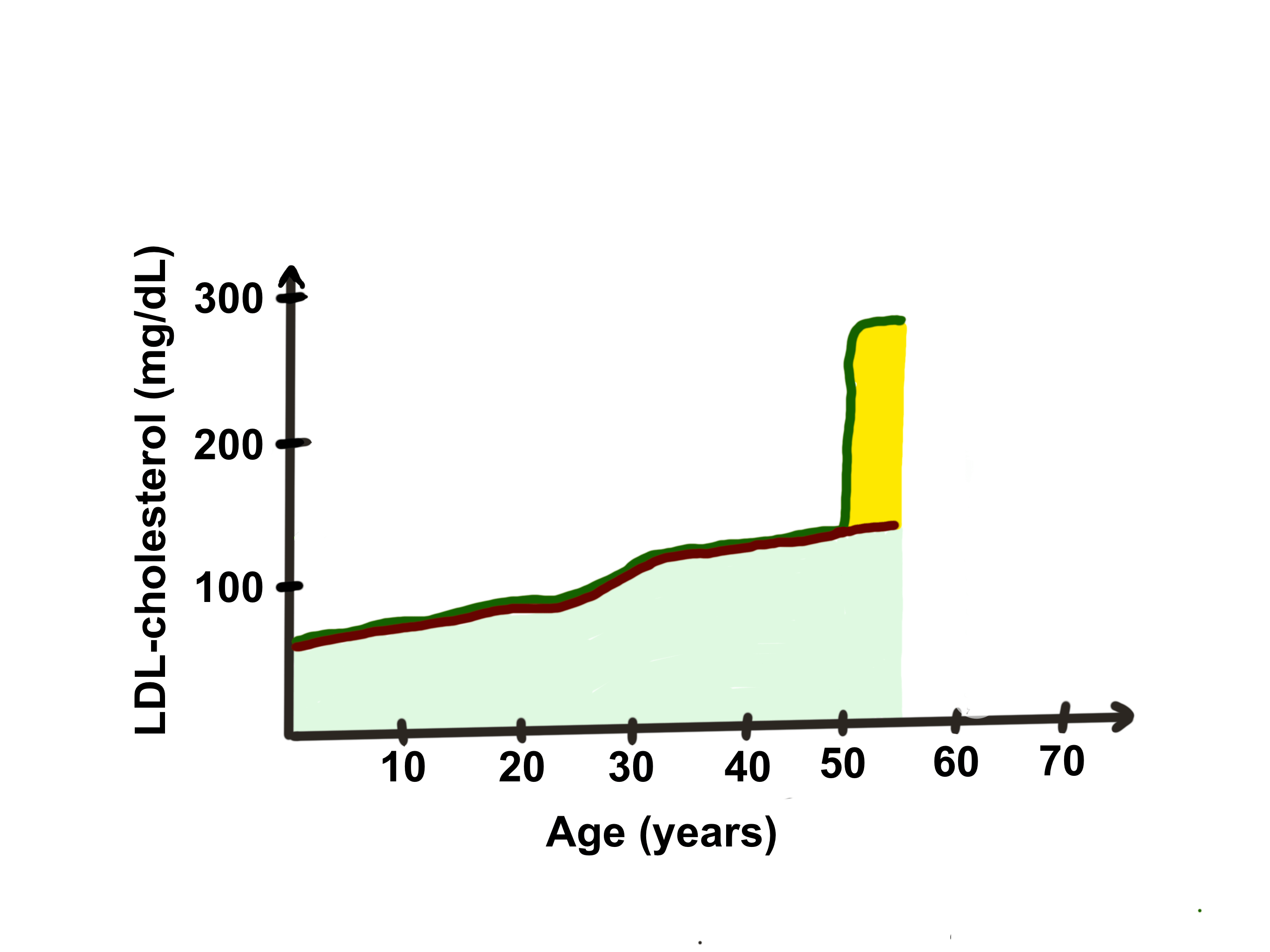 那么解答一下这个断言。我会说,是的,当然,如果这是生命中的前 4.7 年,那么这太短了。动脉粥样硬化斑块可以在不到 5 年的时间内形成,但这需要更高的 LDL 胆固醇水平。然而,这并不是这些参与者生命中的前 4.7 年。相反,在 LMHR 组和匹配的对照组中,在这次基线评估之前的 4.7 年,两组的平均年龄约为 50 岁,我们可以假设他们在此之前对 LDL 胆固醇的暴露程度相似。可能如下图所示,平均而言。请记住,重要的是一生中对 LDL 胆固醇的累积暴露,到他们 50 岁时,两组的参与者已经积累了大量的 LDL 胆固醇暴露。可能大约是 5,000 mg/dL 年,这被认为是 ASCVD 风险开始显现的阈值