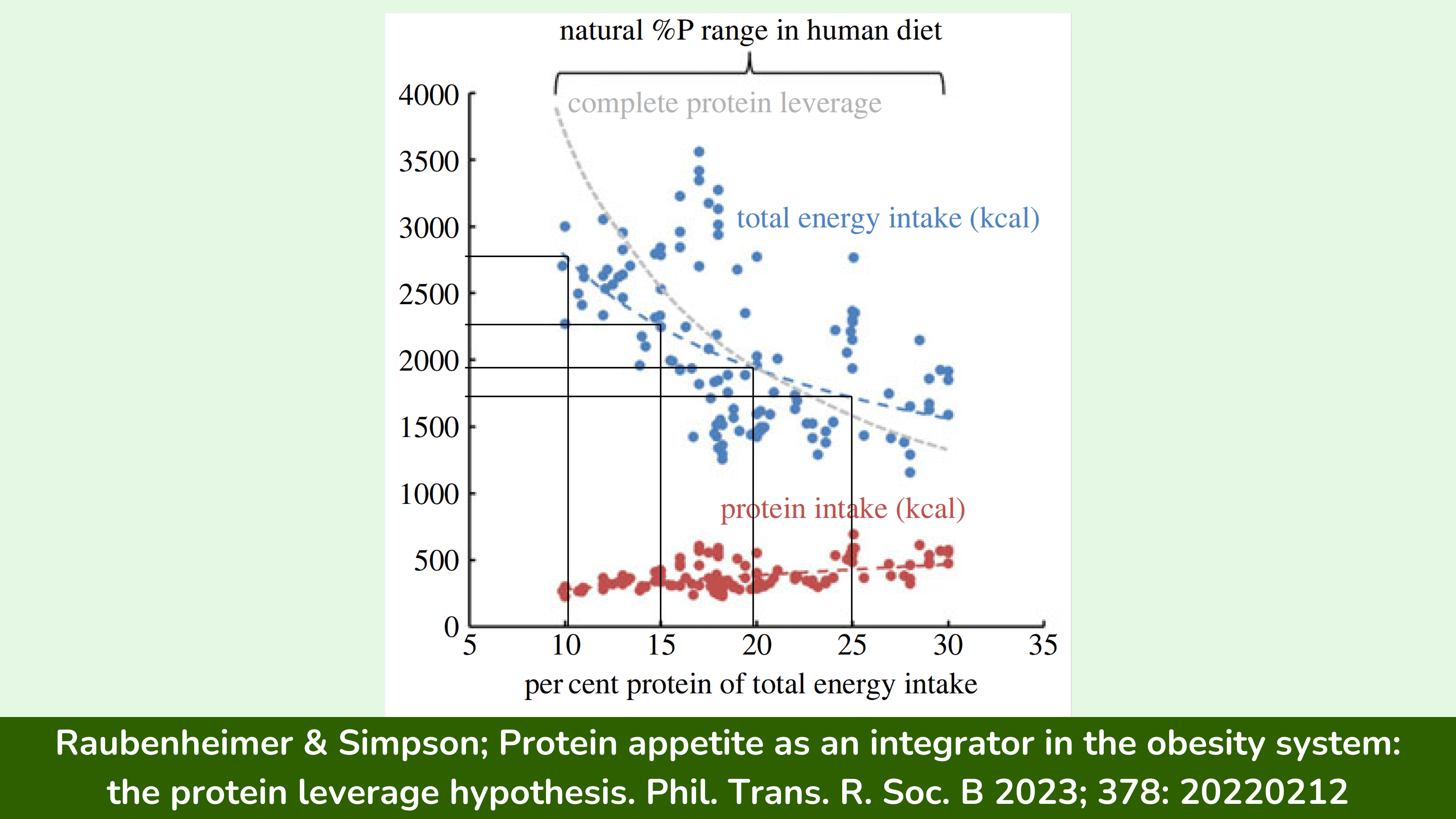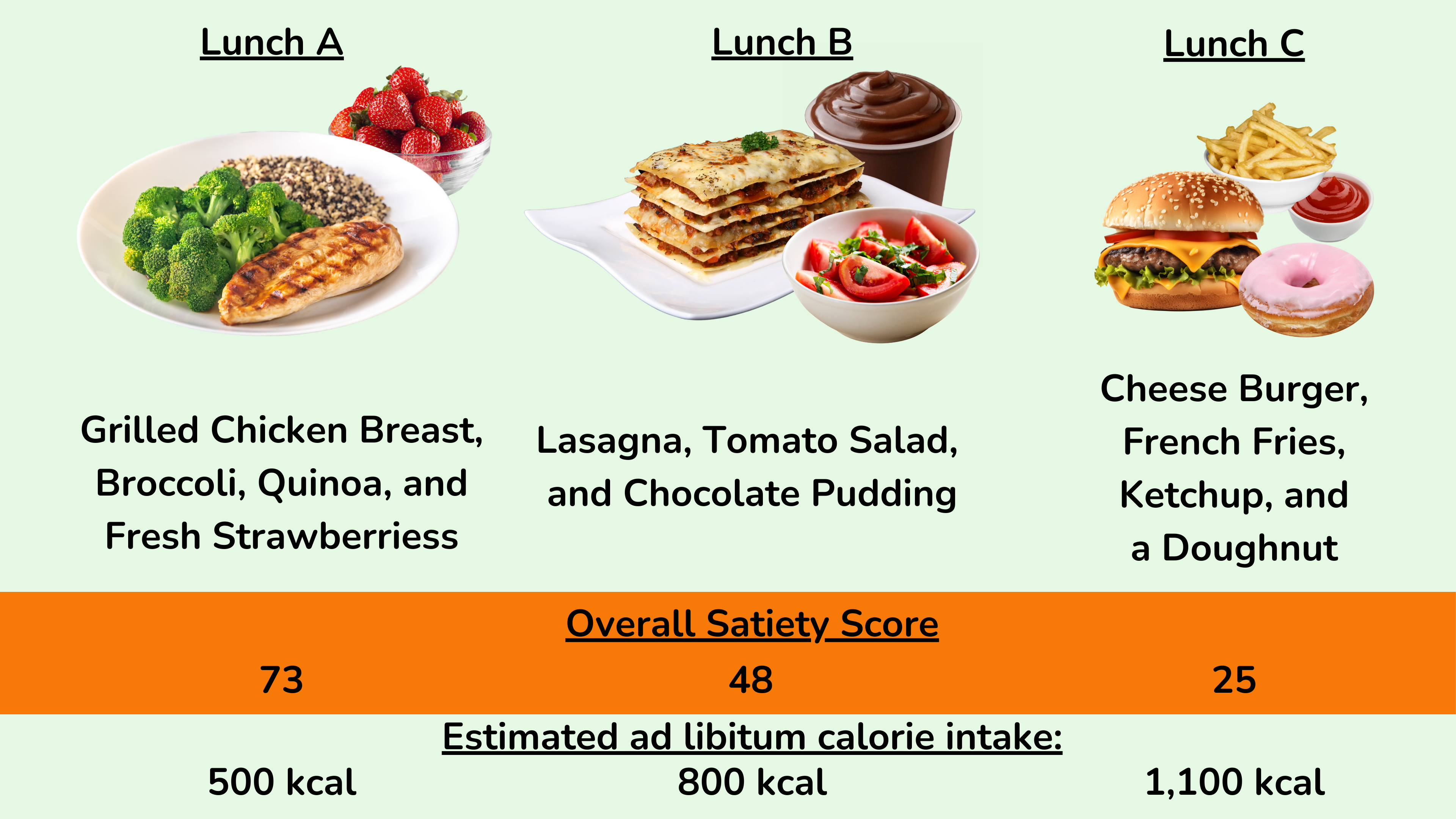 正如我在上一篇博客文章中更详细地解释的那样,我们在一顿饭中需要吃多少卡路里才能感到饱腹,这在很大程度上与这顿饭的蛋白质百分比、纤维含量和能量密度有关。一般来说,如果一顿饭的蛋白质百分比较高、纤维含量较高、能量密度较低,那么它每卡路里摄入的饱腹感就会更强。