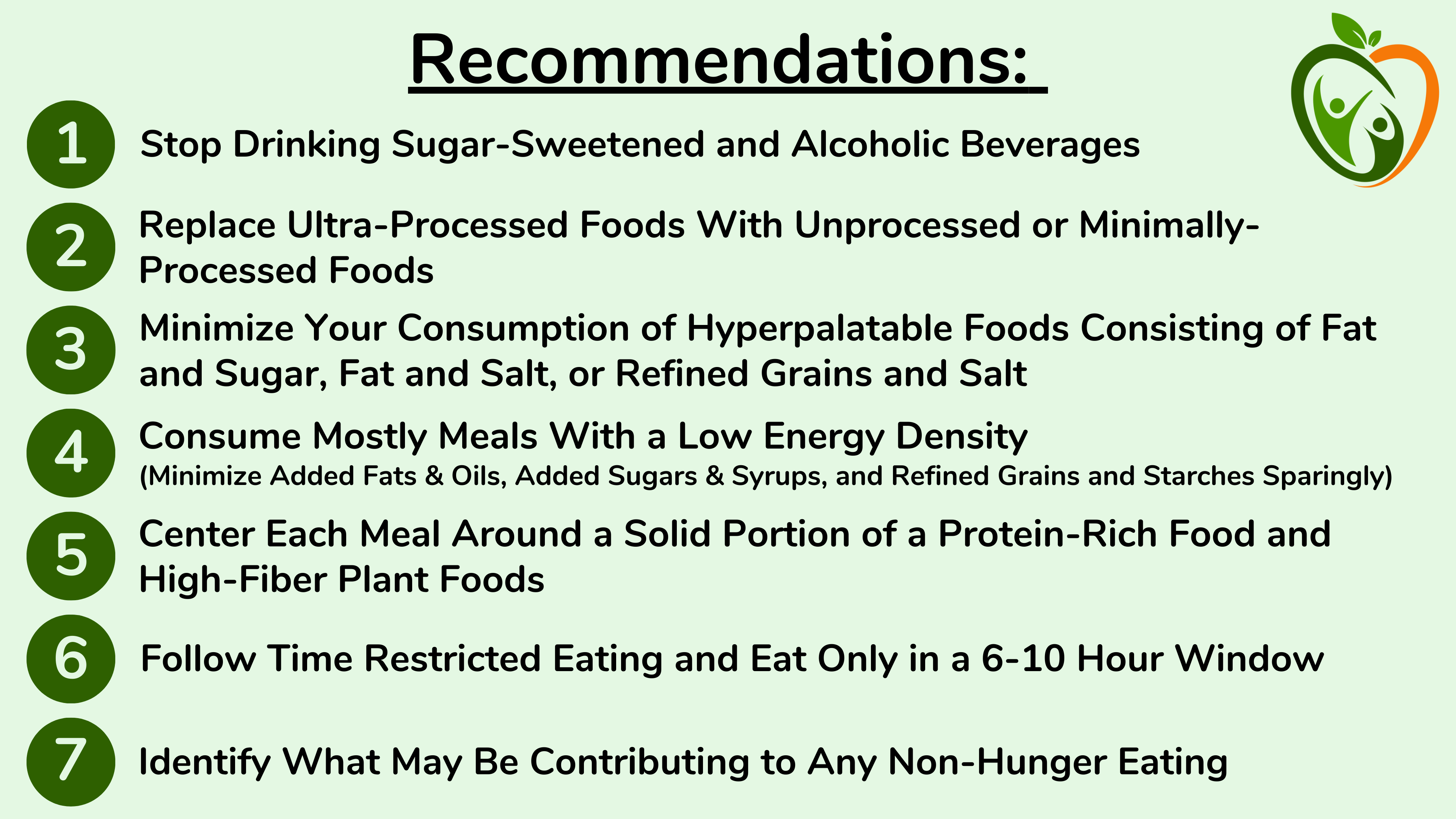 从实践上讲,我建议尽可能多地食用全食或加工程度最低的食物。尽量少喝高热量的饮料,小心添加脂肪和油以及添加糖和糖浆。每餐中至少要包含一些蛋白质。作为女性,每餐至少要摄入 20-30 克蛋白质。作为男性,最低摄入量至少为 30-40 克。