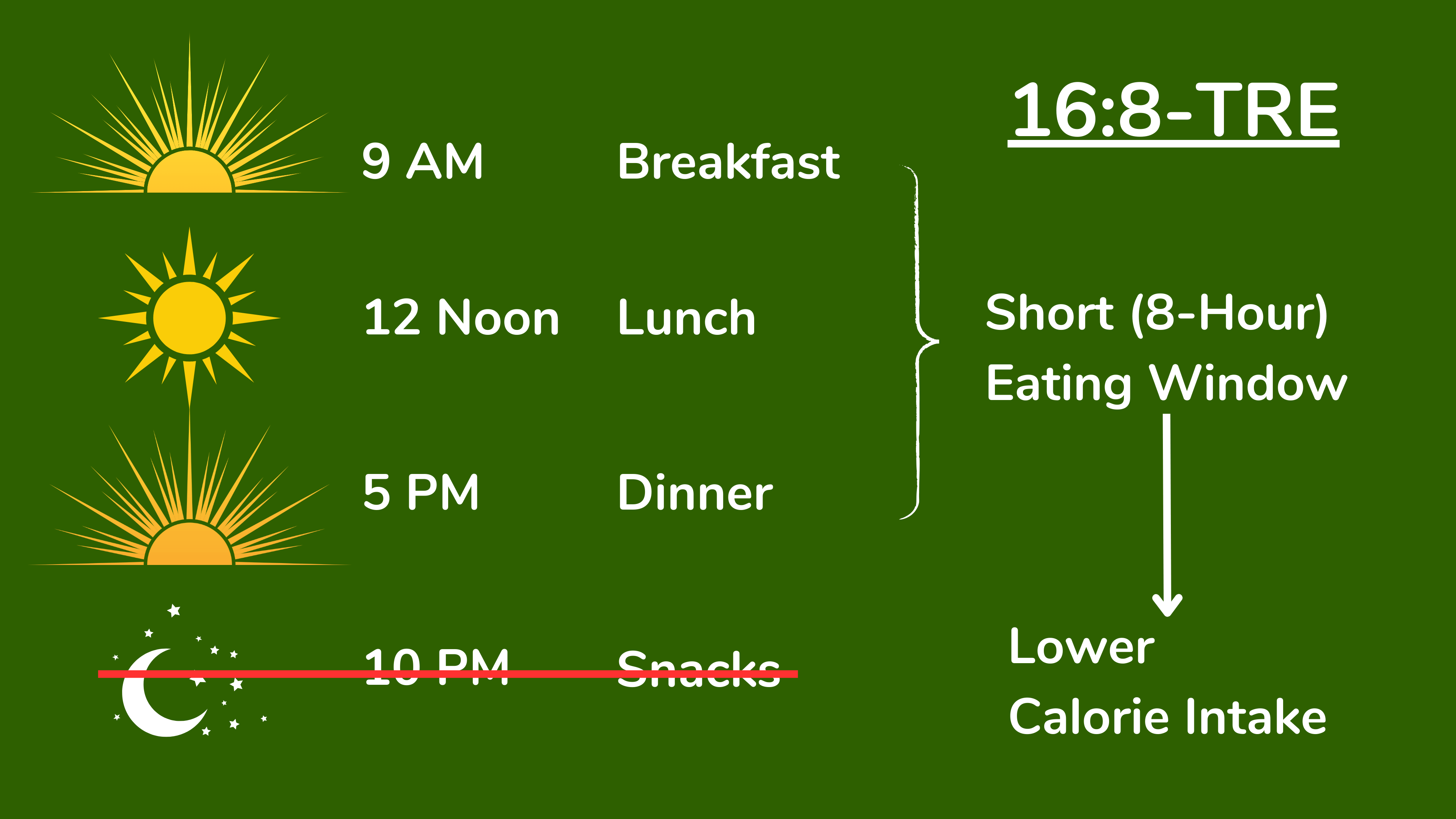 因此,萨姆应该采取限时进食(TRE),即每天在 6-10 小时内摄入所有热量。因此,如果他进行 8 小时限时进食,他可以在上午 9 点到下午 5 点之间进食,然后在一天的剩余 16 小时内不吃。这就是为什么 8 小时限时进食有时也被称为 16:8。