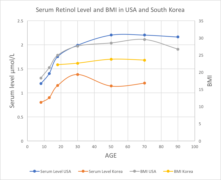 韩国血清维生素A的平均水平远低于同龄美国人。相应地,BMI 水平也是如此。也许更重要的是,韩国的平均 BMI 水平在很宽的年龄范围内都相当稳定,在 60 岁时只会略微上升。因此,高于 1.5 µmol/L 的血清水平可能是危险的,而低于通过身体的常规防御机制更安全地管理。